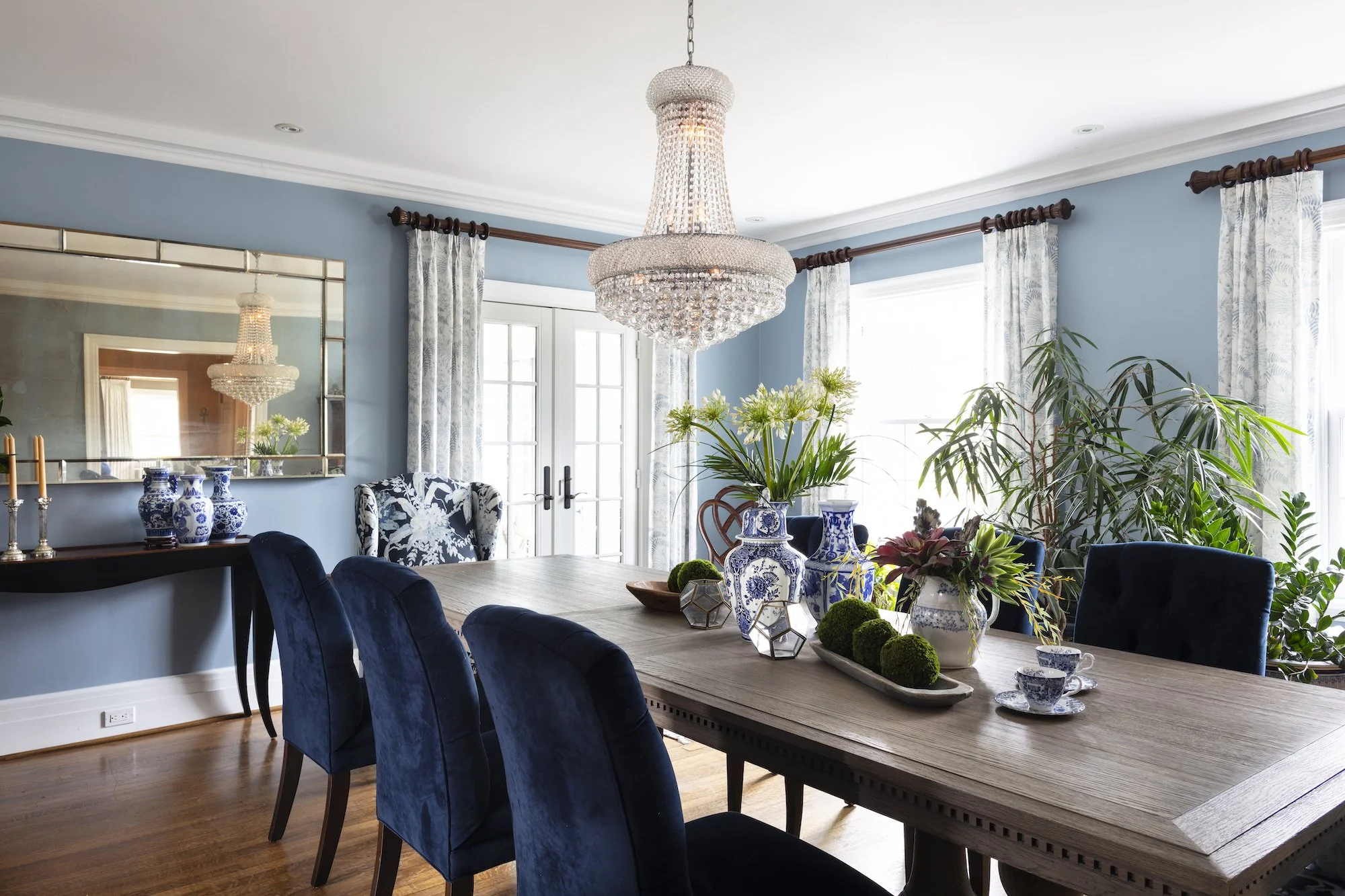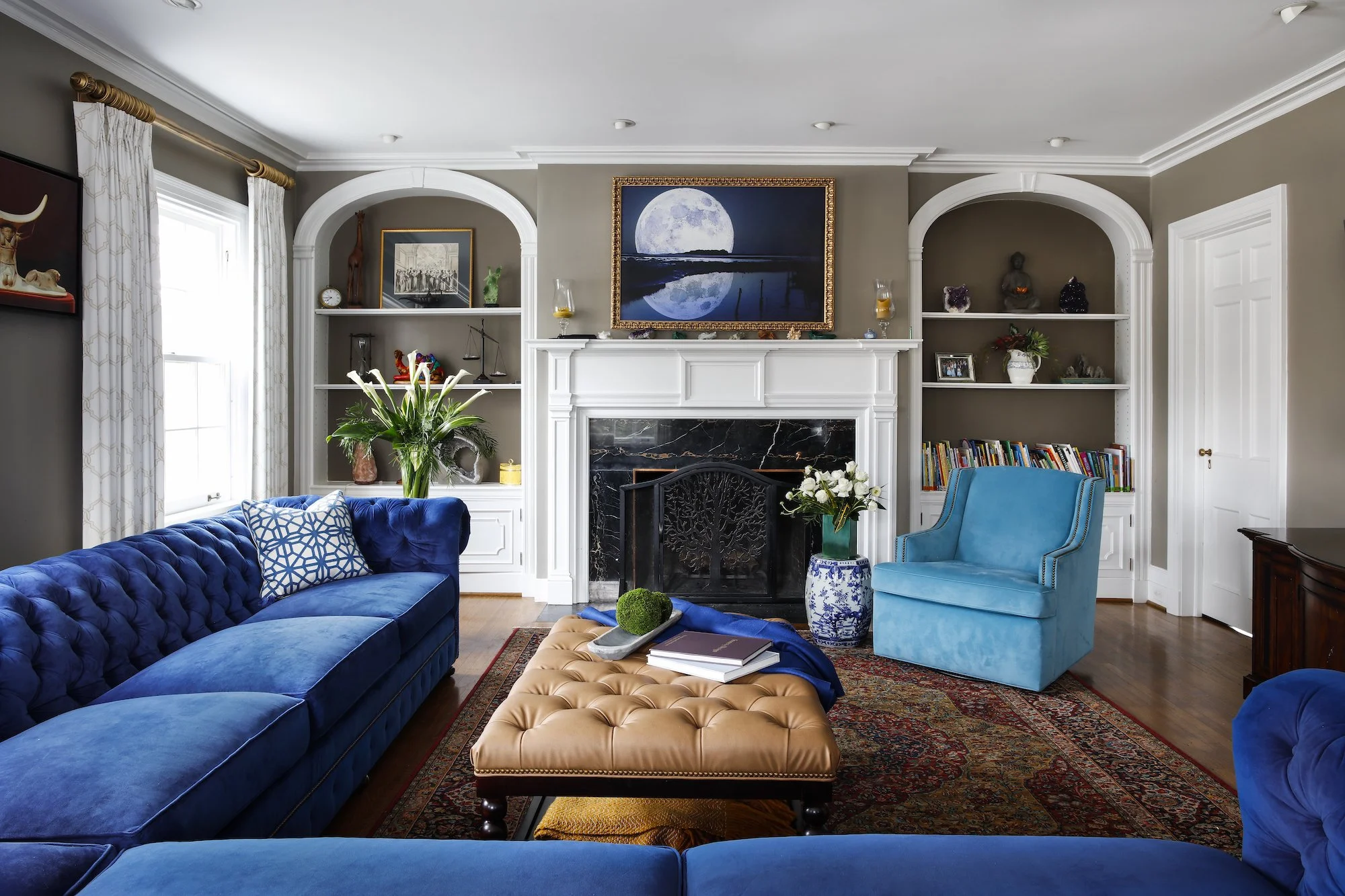 The new sunroom incorporates a pair of swivel chairs and a custom tufted sofa, and the living room features one of Robin’s favorite elements of the home: a massive, custom-made chesterfield sofa upholstered in royal blue velvet. Throughout the home, pieces of artwork grace the space, each telling a story about the homeowners’ travels to foreign countries. In the end, the clients were in love with the design. The way Robin had combined all their favorite things into a uniquely comfortable and family-friendly home made their hearts happy.